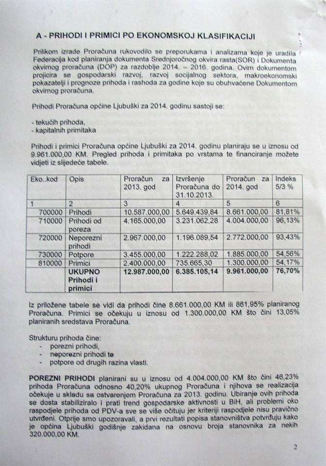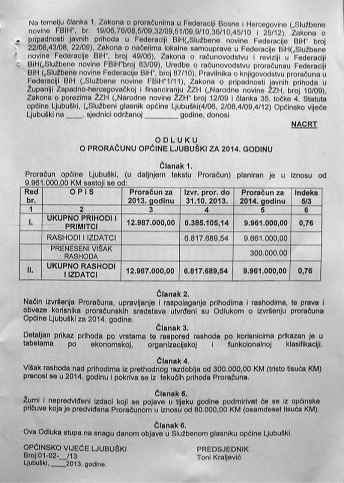 Donosimo planiranu prihodovnu i rashodovnu stranu proračuna za 2014. godinu (ispričavamo se na lošim kopijama, nastalih usljed tehničkih problema). Ekonomisti će vidjeti pravu financijsku katastrofu općine Ljubuški., dok ćemo javne službe prikazati u jednom od sljedećih tekstova.