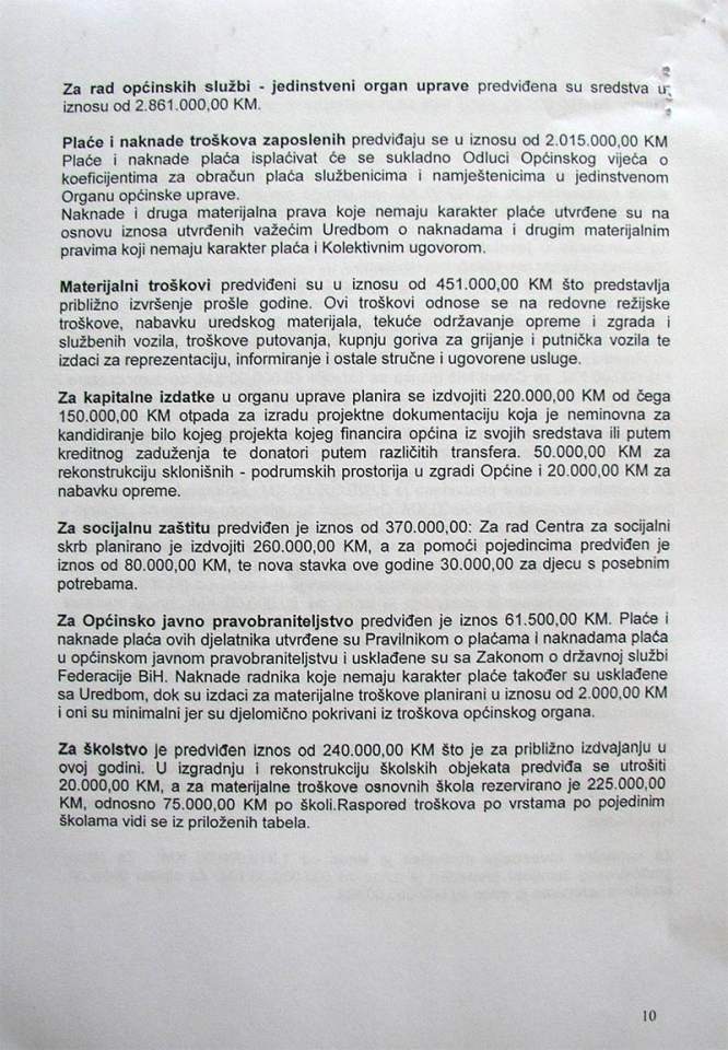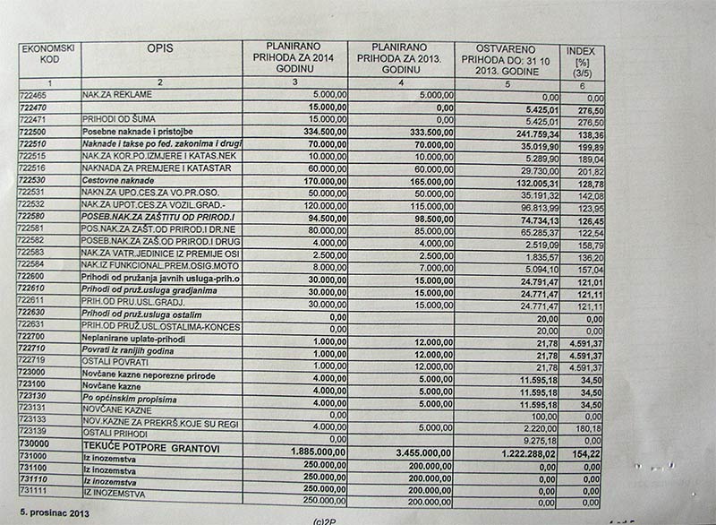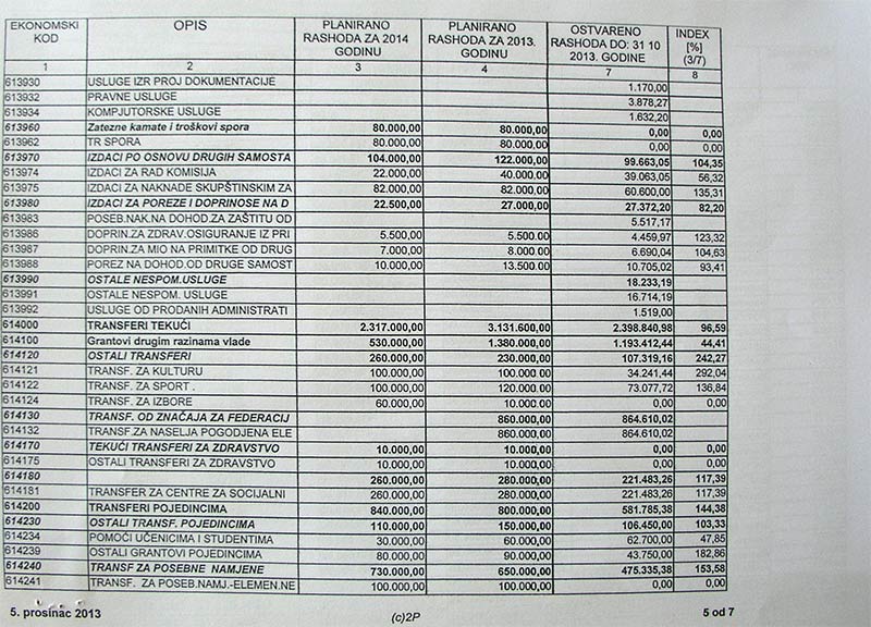 Do 31. listopada izvršenje proračuna za 2013. godinu je bilo 6.385.105,14 KM od planiranih 12.987.000,00 KM, što je 49% od planiranog. Već godinama nam se pred oči stavljaju proračuni od 11, 12, 13 milijuna KM, kako bi se javnosti pojavio bljesak novca za nikada ostvarene planove o ulaganjima i razvoju općine.