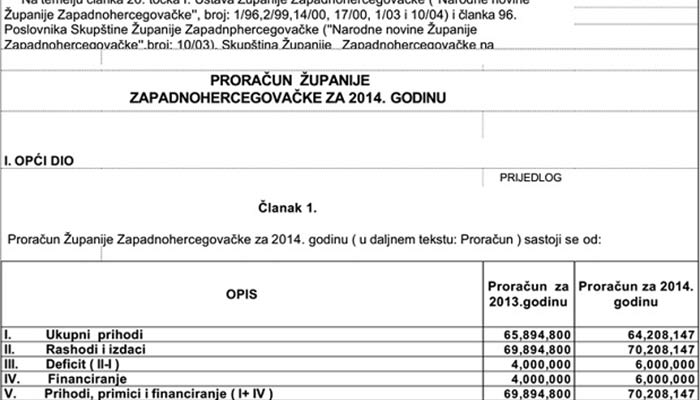Donosimo dokumente vezane za Proračun Županije Zapadnohercegovačke u 2014. godini. Zasigurno ima dosta onih koji bi ga željeli proanalizirati, vidjeti za koja ministarstva se izdvaja više, a za koja manje novca nego ranije, koje su stavke uvećane, a koje umanjene.