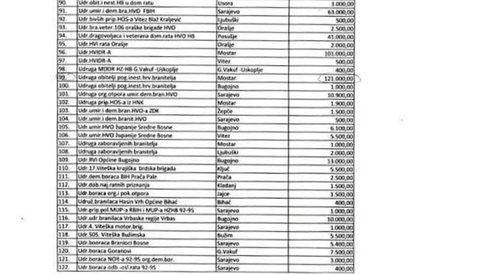 Također, HVIDRA-i Mostar isplaćeno je 101.000 KM, Udruzi branitelja i veterana Domovinskog rata HVO HB (Posušje) 41.000 KM, Udruzi organizatora otpora i umirovljenih i demobiliziranih branitelja HVO-a (Mostar) 10.900 KM, Udruzi umirovljenih i demobiliziranih branitelja HVO-a F BiH (Sarajevo) 63.000 KM itd.