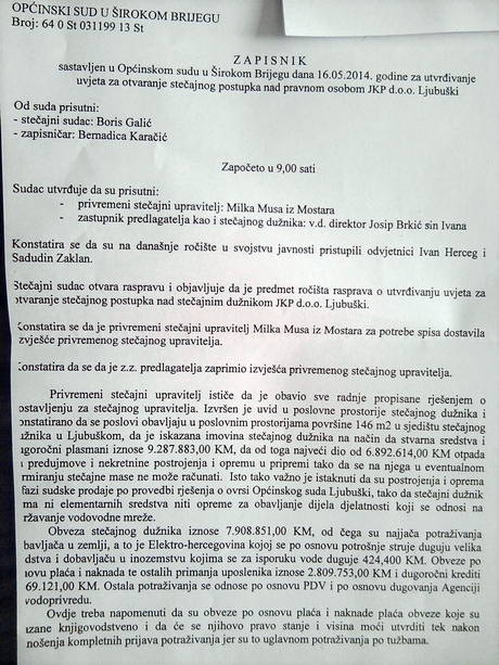 Danas je na Općinskom sudu u Širokom Brijegu održano ročište na kojem su se utvrđivali uvjeti za otvaranje stečajnog postupka nad JKP d.oo Ljubuški.