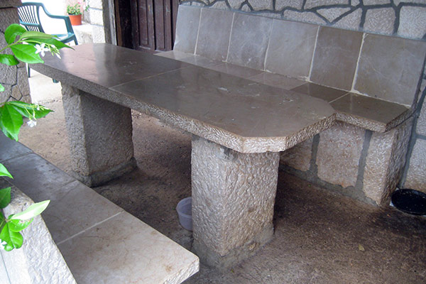 Na zapadnoj strani donje "pristave" je ljetna kužina. Naravno, sva je od kamena i ispred nje je kameni stol i klupe s naslonima. Na istočnoj strani kužine je slavina ispod koje su kameni stalak i "zdjelica", a na njoj su uklesane dvije ruke, kao da hoće uhvatiti kapljice vode. Ispred kuće su zidovi, stubovi, stepenice, posude za cvijeće (amfore).... Sve od klesana kamena; sve odraz urođena talenta i tradicije koju je Matiša, a zatim Drago naslijedio od svojih djedova i očeva.