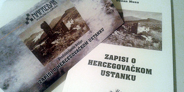 HKD Napredak, podružnica Ljubuški ima čast pozvati Vas na predstavljanje knjige Zapisi o Hercegovačkom ustanku, autora Dušana Muse. Predstavljanje će se održati 11. studenog 2015. godine u Gradskoj vijećnici s početkom u 19 sati.