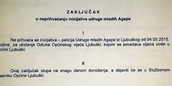 "Nakon što je toliko vremena prošlo od potpisivanja peticije i raznih naših zahtjeva za obrazloženje ili komentar od strane OV-a, pa i, usuđujemo se reći, nemara i izrugivanja tolikom broju nezadovoljnih građana, držeći ih u neizvjesnosti, očekivali smo mnogo. Međutim, sinoć je do nas došao materijal koji je povodom ove točke upućen vijećnicima. U materijalu koji nosi naslov: "ZAKLJUČAK o neprihvaćanju inicijative Udruge mladih Agape" stoji samo jedna prosto-proširena rečenica: "Ne prihvaća se inicijativa - peticija Udruge mladih Agape iz Ljubuškog od 04.05.2015. godine za ukidanje Odluke Općinskog vijeća Ljubuški, kojom se povećava cijena vode u Općini Ljubuški". Nama ovo ne upućuje na ono što smo tražili - a to je ponovno izglasavanje odluke. Hoće li u petak doći do tog ponovnog izlasavanja - ne znamo, ali ono što možemo jeste pozvati sve građane da s nama u ovoj (neočekivano dugoj) borbi ostanu do kraja i postide i prozovu one koji se još jednom usude usvojiti prethodnu odluku OV-a kojeg smo mi birali. Na izborima do kojih može i vanredno doći."
