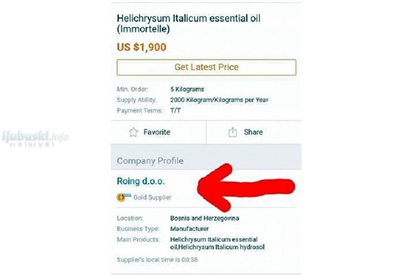 Međutim, da bi se uistinu stekao dojam o čemu se radi, potrebno je najprije vidjeti kako se trenutačno kreću cijene jednog kilograma esencijalnog ulja od smilja na međunarodnom tržištu. Iako na najvećoj online trgovini eBay nema ni naših otkupljivača ni naših uzgajivača, stanje na Alibabi i Tradekeyu je posve drukčije. Inače, napomenimo kako je Alibaba kineska online trgovina koja je u posljednje vrijeme po svom ostvarenom prometu i megapopularnosti zasjenila općeprihvaćeni eBay u svakom pogledu. Na Alibabi se lijepo može vidjeti kako bh. otkupljivači vrše prodaju esencijalnog ulja od smilja po cijeni od 1900 USD (3358,71 KM) po kilogramu. Ako se uzme u obzir otkupna cijena od 3 KM, te kako je za dobivanje jednog kg ulja od smilja u destilerijama potrebno od 350 do 500 kg smilja, vidljivo je kako je riječ o više nego dobrom profitu od 2308 KM po jednom kilogramu ulja.