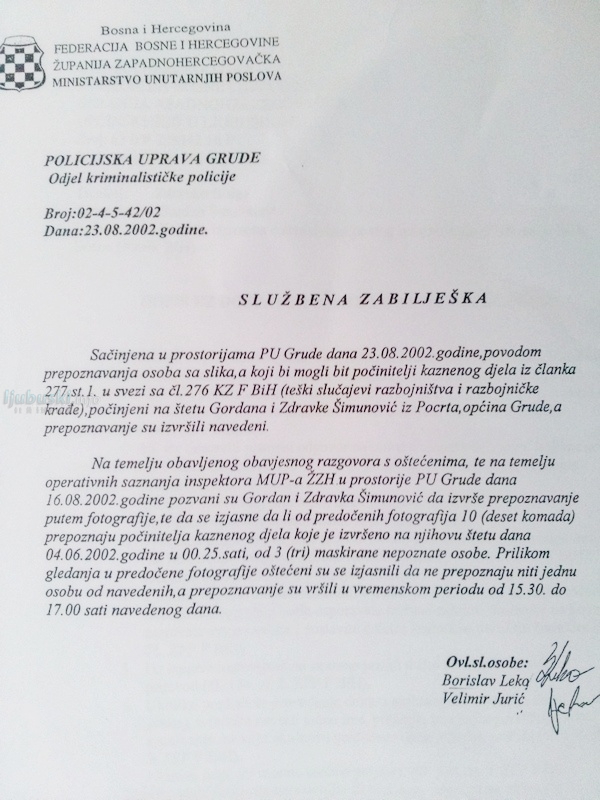 Kontaktirali smo i Gordana Šimunovića, koji je kazao kako policijski službenik Velimir Jurić nije sudjelovao u postupku prepoznavanja dana 16. kolovoza 2002. godine, te da je bio iznenađen kada je na zabilješci, vidio njegov potpis.