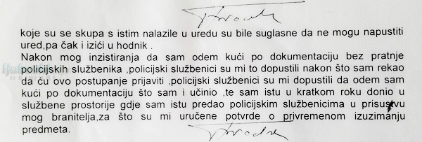 Izjava dana u večernjim satima nakon višesatnog maltretiranja od strane inspektora, čijim se dječačkim igrama pridružio i Stanislav Nižić, zamjenik načelnika Odjela kriminaliteta MUP-a ZHŽ Miroslava Galića. Naravno scenaristi na djelu nisu, ali protiv istine ne mogu bilo što učiniti.