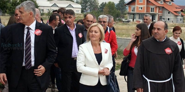 Dragan Čović, Borjana Krišto i fra Vinko Sičaja u predizbornoj kampanji sa stranačkim bedževima