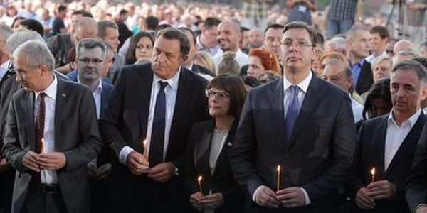 Srbijanski premijer i novoizabrani predsjednik te države Aleksandar Vučić pojavio se na komemoraciji uz gotovo dvosatno zakašnjenje poremetivši cijeli program koji je privremeno prekinut da bi se Vučiću usred prisjećanja na žrtve zločina pljeskalo.