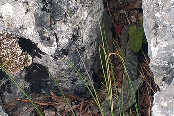 Nastavili smo dalje, i negdje na otprilike 1050m sreli još jednog hercegovca. Bio je to poskok koji se odmarao između dva kamena, i koji nam je spremno pozirao. Odlučili smo mu poštedjeti život, kako ne bismo naljutili njegovu braću. Pokazalo se to ubrzo kao pametan potez, jer na putu do vrha smo susreli mnogo njegove braće, ali nijedan od njih nije nam naudio. Sigurni smo i da jedan od mnogih poskoka koje smo vidjeli nije bio brat već otac ili majka. Takva veličina i obujam zmije rijetko se viđa u našim krajevima.