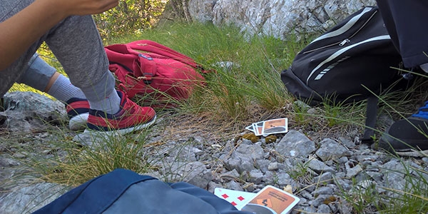 Na otprilike 950m nadmorske visine pronašli smo idealno mjesto za odmor. Tradicionalni roštilj na praljku zamijenili smo ovaj put nešto modernijim roštiljem na pravoj metalnoj rešetki. Hladovinu je upotpunjavao i lagani povjetarac. Osim što smo okrijepili organizam, bilo nam je još važnije da smo se riješili tereta u ruksaku, i potpuno olakšali prtljagu. Josip je prihvatio Stankin izazov za partiju bele, ali kako ne znam ni pravila te igre, tako nisam na kraju razumio ni koji je od njih dvojice pobijedio.