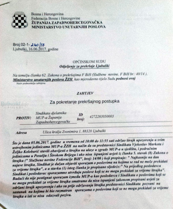 Dana 16.6.2017. godine (petak), na adresu Sindikata djelatnika MUP-a ŽZH pristigao je Zahtjev za pokretanje prekršajnog postupka, kojeg je potpisao ministrar MUP-a ZHŽ Zdravko Boras. Zahtjev je upućen Općinskom sudu Ljubuški a traži se kažnjavanje Sindikata djelatnika MUP-a, koje već, u zahtjevu, naziva "okrivljenima".