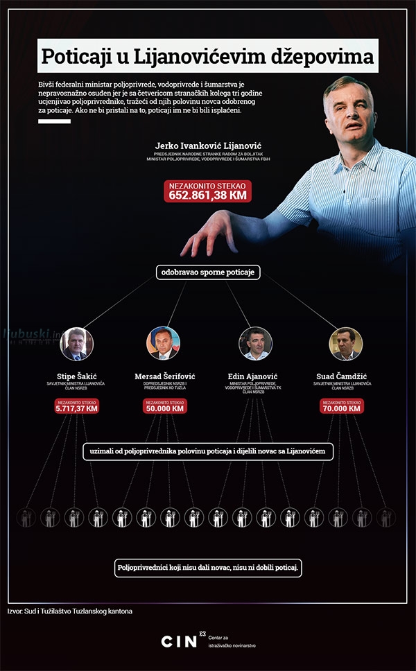 Jerka Ivankovića Lijanovića, bivšeg federalnog ministra poljoprivrede, Kantonalni sud u Tuzli osudio je na zatvorsku i novčanu kaznu zbog nezakonite dodjele poticaja. Pravosuđe još nije istražilo sve prijave o nezakonitostima pri dodjeli poticaja i kupovini glasova proračunskim novcem.