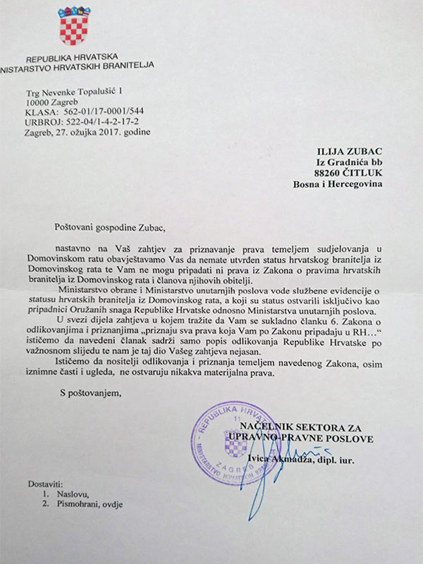 Unatoč svim odličjima i priznanjima, i drugim dokumentiranim dokazima, Ilija od Ministarstva Hrvatskih branitelja dobiva ponižavajuće napismenu odbijenicu.