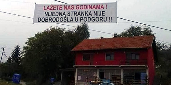 Na transparentu koji je postavljen u samom središtu piše Nijedna stranka nije dobrodošla u Podgoru, lažete nas godinama!