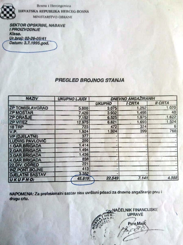 Evo povjerljivog dokumenta iz ratne 93. koji svjedoči o brojnom stanju pripadnika HVO-a iz tog vremena: