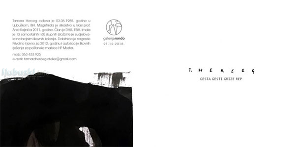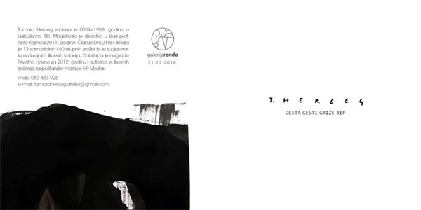 Ciklus radova "Gesta gesti grize rep" nastao je 2018. godine kao svojevrsni nastavak na moj dosadašnji likovni izričaj. U duhu eksperimentalnog slikarstva, bavim se proučavanjem pokreta i slučaja. Radovi nastaju ogoljenom likovnom tehnikom koja se svodi na tuš i papir. Način na koji će se tuš razliti po papiru je stvar slučaja, a daljnje razmazivanje špahtlom odraz mojih gestualnih pokreta. Radovi nastaju brzo, spontano, ekspresivno i gotovo nikad ne radim intervencije na nastalu "gestu". Crni pokreti u duhu stvaralačkog oduševljenja prelaze u očajanje na statičnim bijelim podlogama, čineći kontrastnu cjelinu koja živi zbog stvaranja. To je jedina zbilja na koju se možemo osloniti u razumijevanju. "Geste" su "amor fati", ne izlaz straha, niti agona, već izraz izmirenja, ljubavi prema događanju. One nisu identično određene poput proizvoda logičke i matematičke spoznaje, one su ono što nikad nije i što uvijek samo postaje. Da li će ih promatrač shvatiti kao spoznaju uzaludnosti ili sumnju u vlastitu stvaralačku moć, ili pak kao niz uzastopnih pokušaja, eksplikacija uzaludnog traženja odgovora, ovisi o njemu. Istinitost ljudskih dilema je građa kojoj umjetnički oblik daje smisao, poručuje Tamara.