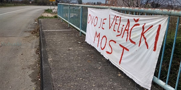 "Ovo je Veljački most" i "Ne krećite unaše" transparenti su koji su osvanuli na mostu iznad rijeke Mlade na regionalnoj cesti Vitina - Veljaci - državna granica RH.