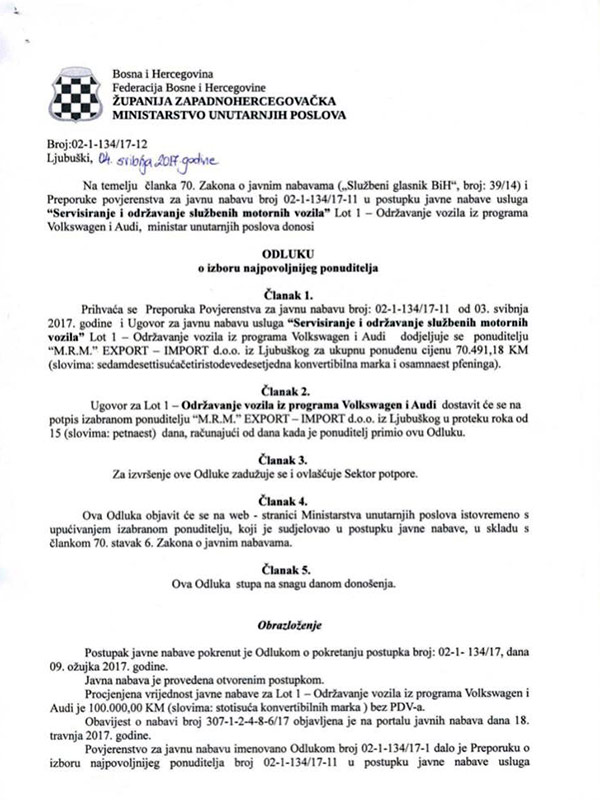 Bivši ministar MUP-a Zapadnohercegovačke županije Zdravko Boras u razdoblju od 2016. godine do kraja 2019. godine sklopio je ugovore s tvrtkom M.R.M Export-Import d.o.o. Ljubuški u vrijednosti od milijun i sto tisuća konvertibilnih maraka.