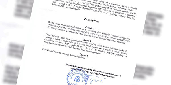 Krizni stožer Ministarstva zdravstva, rada i socijalne skrbi Zapadnohercegovačke županije je u utorak održao 13. sjednicu na kojoj je donesena Zapovijed broj: 08- KS-22-7/20 kojom su produžene mjere donesene radi sprječavanja širenja koronavirusa (COVID-19).
